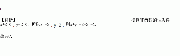 C 【解析】根据非负数的性质得x+3=0,y-2=0,所以x=-3,y=2,则x+y=-3+2=-1. 故选C.