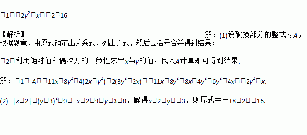 (1)-2y2+x;(2)16 【解析】【解析】 (1)设破损部分的整式为A,根据题意,由原式确定出关系式,列出算式,然后去括号合并得到结果; (2)利用绝对值和偶次方的非负性求出x与y的值,代入A计算即可得到结果. 【解析】 (1) A=-11x+8y2+4(2x-y2)-2(3y2-2x)=-11x+8y2+8x-4y2-6y2+4x=-2y2+x. (2)∵|x-...