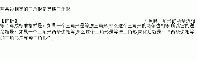 两条边相等的三角形是等腰三角形 【解析】“等腰三角形的两条边相等”写成标准格式是:如果一个三角形是等腰三角形,那么这个三角形的两条边相等.所以它的逆命题是:如果一个三角形两条边相等,那么这个三角形是等腰三角形.简化后就是:“两条边相等的三角形是等腰三角形”.