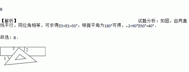 B 【解析】试题分析:如图,由两直线平行,同位角相等,可求得∠3=∠1=50°,根据平角为180°可得,∠2=90°﹣50°=40°. 故选:B.