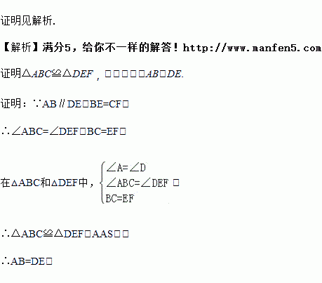 如图,AB∥DE,∠A=∠D,BE=CF.求证:AB=DE.