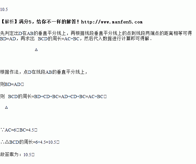 如图,在中,,分别以点为圆心,4为半径画弧,交于两点,过这两点的直线交边于点,连接,则的周长是_________.
