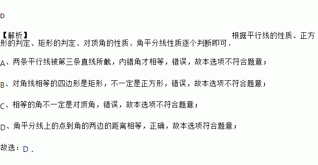 C. 相等的角是对顶角 D. 角平分线上的点到角两边的距离相等