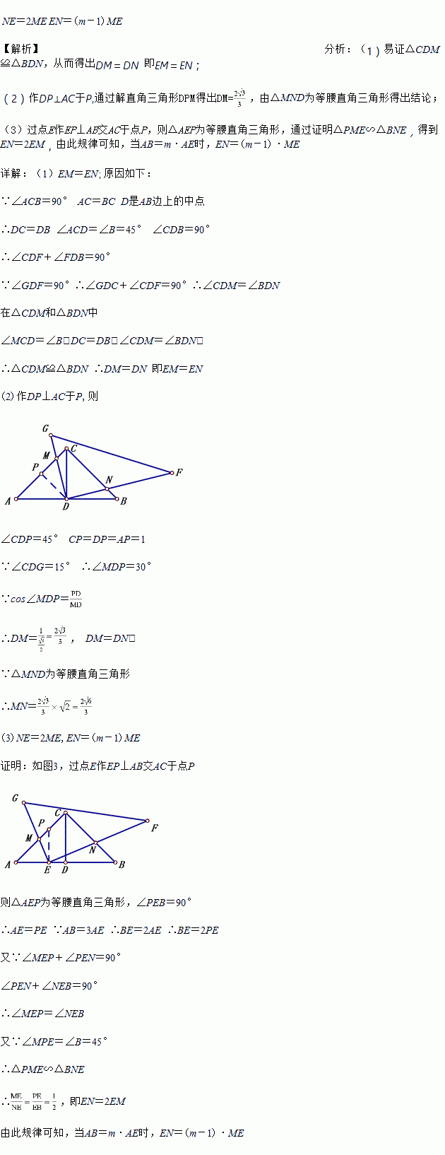 (3) 图3, 旋转后,若Rt△EGF的顶点E在线段AB上移动(不与点D、B重合),当AB=3AE时,线段EM与EN的数量关系是________;当AB=m·AE时,线段EM与EN的数量关系是__________.