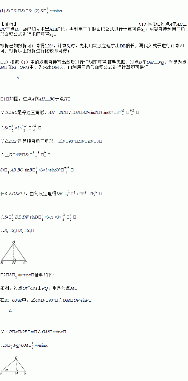 (2)在图③中,∠P=α(α为锐角),OP=m,PQ=n,△OPQ的面积为S,请你根据第(1)小题的解答,直接写出S与m,n以及α之间的关系式,并给出证明.