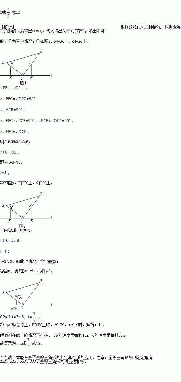 如图,△ABC中,∠ACB=90°,AC=6cm,BC=8cm.点P从A点出发沿A→C→B路径向终点运动,终点为B点;点Q从B点出发沿B→C→A路径向终点运动,终点为A点.点P和Q分别以每秒1cm和3cm的运动速度同时开始运动,两点都要到相应的终点时才能停止运动,在某时刻,分别过P和Q作PE⊥l于E,QF⊥l于F.设运动时间为t秒,则当t=_________秒时,△PEC与△QFC全等.