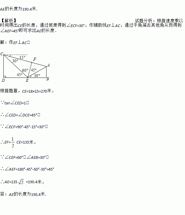 如图,小丽假期在娱乐场游玩时,想要利用所学的数学知识测量某个娱乐场地所在山坡AE的长度.她先在山脚下点E处测得山顶A的仰角是30°,然后,她沿着坡度是i=1:1(即tan∠CED=1)的斜坡步行15分钟抵达C处,此时,测得A点的俯角是15°.已知小丽的步行速度是18米/分,图中点A、B、E、D、C在同一平面内,且点D、E、B在同一水平直线上.求出娱乐场地所在山坡AE的长度.(参考数据: