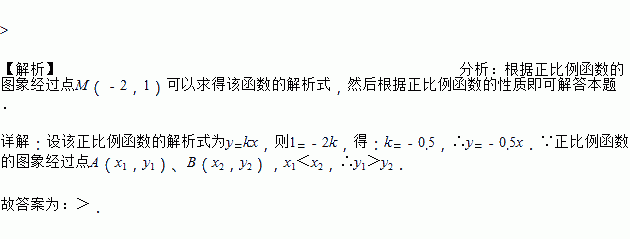 已知正比例函数的图像经过点M( )、、,如果,那么________.(填“>”、“=”、“<”)
