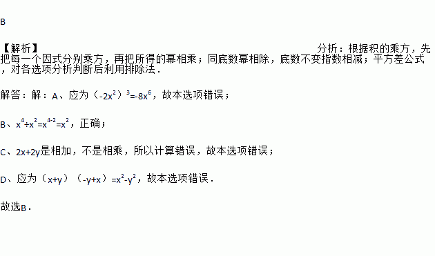 B 【解析】分析:根据积的乘方,先把每一个因式分别乘方,再把所得的幂相乘;同底数幂相除,底数不变指数相减;平方差公式,对各选项分析判断后利用排除法. 解答:【解析】 A、应为(-2x2)3=-8x6,故本选项错误; B、x4÷x2=x4-2=x2,正确; C、2x+2y是相加,不是相乘,所以计算错误,故本选项错误; D、应为(x+y)(-y+x)=x2-y2,故本选...