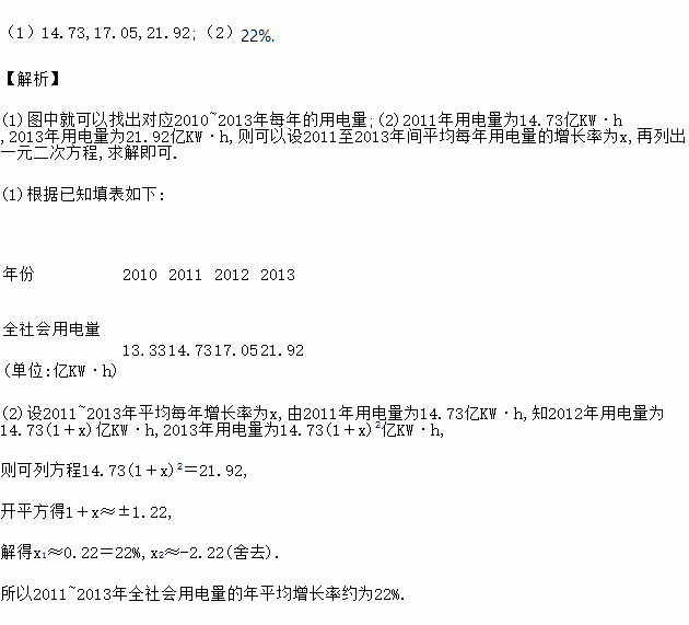 (2)根据丽水市2010年至2013年全社会用电量统计数据,求2011~2013年全社会用电量的年平均增长率(保留到0.01).