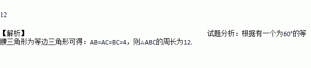 已知△ABC中,AB=AC=4,∠A=60°,则△ABC的周长为______.