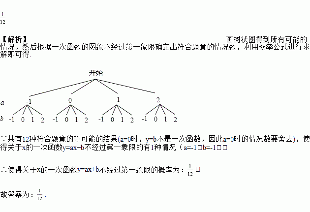 从-1,0,1,2这4个数中,随机抽取一个数记为a,放回并混在一起,再随机抽取一个数记为b,则使得关于x的一次函数y=ax+b的图象不经过第一象限的概率为________.