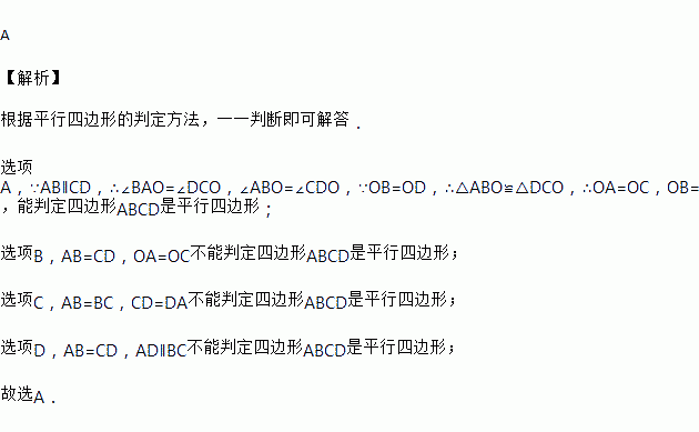 已知四边形ABCD,对角线AC,BD交于点O,下列条件能判定它是平行四边形的是( )