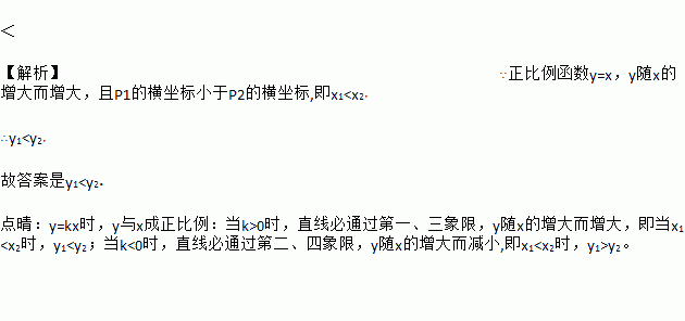 已知P1(1,y1),P2(2,y2)是正比例函数y=x的图象上的两点,则y1____y2(填“>”或“<”或“=”).