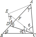 (2)作△BDC关于CD的对称图形△CDE,连接AE,利用轴对称的性质和角的关系得出EF=DF,进而得出AF=FC,得出∠6=∠7,从而可以得出结论.