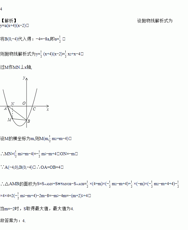 已知抛物线经过A(﹣4,0)、B(0,﹣4)、C(2,0)三点,若点M为第三象限内抛物线上一动点,△AMB的面积为S,则S的最大值为_____.