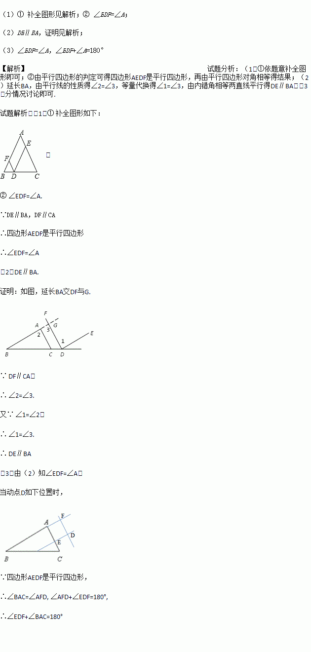 (3)如图3,点D是△ABC外部的一个动点,过D作DE∥BA交直线AC于E,DF∥CA交直线AB于F,直接写出∠EDF与∠A的数量关系(不需证明).