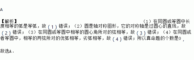 A 【解析】(1)在同圆或等圆中长度相等的弧是等弧,故(1)错误;(2)圆是轴对称图形,它的对称轴是过圆心的直线,故(2)错误;(3)在同圆或等圆中相等的圆心角所对的弦相等,故(3)错误;(4)在同圆或者等圆中,相等的两弦所对的优弧相等,劣弧相等,故(4)错误;所以真命题的个数是0, 故选A.
