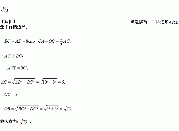 如图,在□ABCD中,AC,BD相交于点O,AB=10cm,AD=8cm,AC⊥BC,则OB= _________cm.