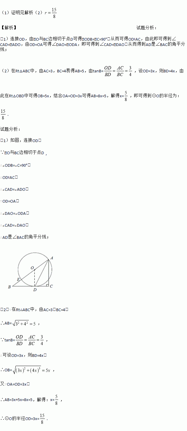 (2)若AC= 3,BC=4,求⊙O的半径.