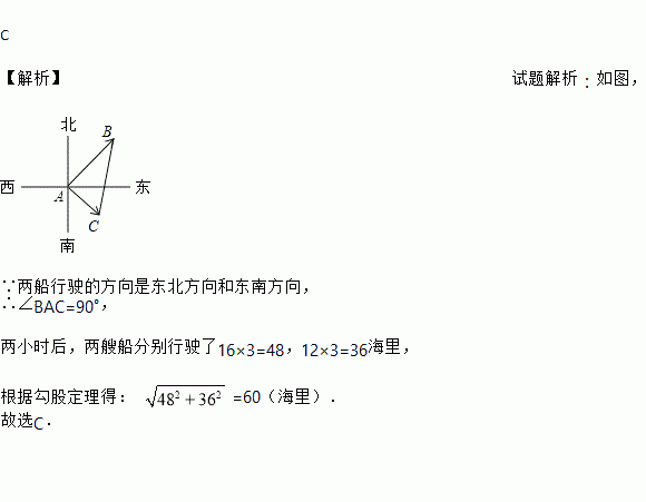 一艘轮船以16海里∕小时的速度从港口A出发向东北方向航行,另一轮船12海里∕小时从港口A出发向东南方向航行,离开港口3小时后,则两船相距( )