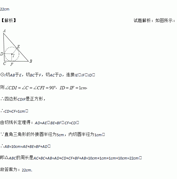 直角三角形的外接圆半径为5cm,内切圆半径为1cm,则此三角形的周长是_______.