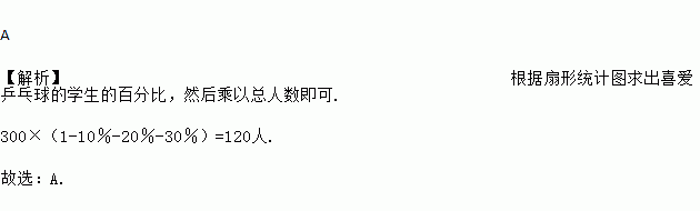 宜宾市某校开展第二课堂,组织调查了本校300名学生各自最喜爱的一项体育活动,制成了如下的扇形统计图,则在被调查的学生中,喜爱乒乓球的学生人数是( )