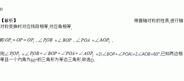 D 【解析】根据轴对称的性质,进行轴对称变换时对应线段相等,对应角相等, 即, ∠=∠, ∠=∠, 则∠=∠=2(∠BOP+∠POA)=2∠AOB=60°,已知两边相等且一个内角为60°的三角形为等边三角形,故选D.
