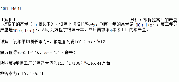 已知某工厂计划经过两年的时间,把某种产品从现在的年产量100万台提高到121万台,那么每年平均增长的百分数是_____%.按此年平均增长率,预计第4年该工厂的年产量应为_____万台.>