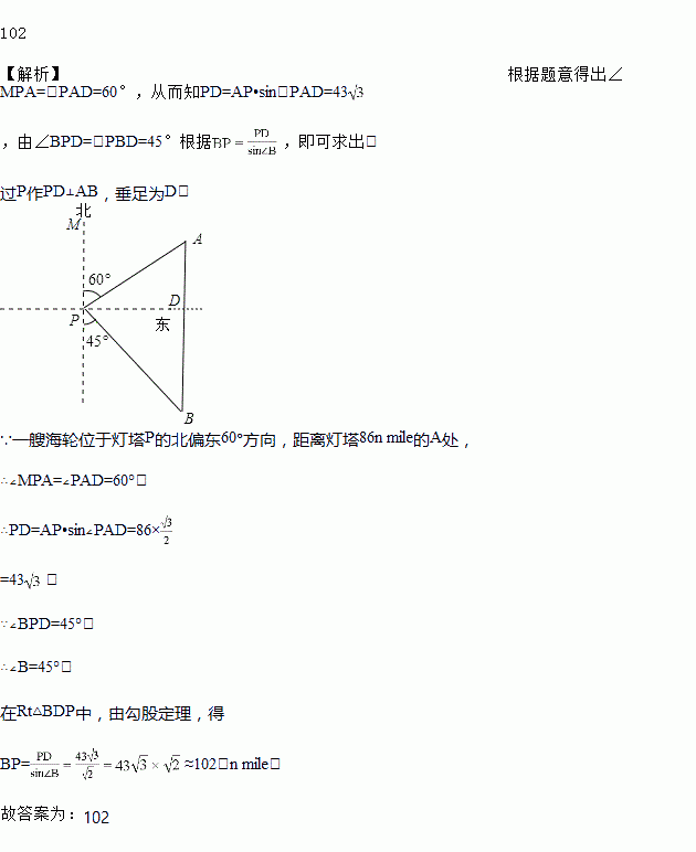 如图,一艘海轮位于灯塔P的北偏东60°方向,距离灯塔86 n mile的A处,它沿正南方向航行一段时间后,到达位于灯塔P的南偏东45°方向上的B处,此时B处与灯塔P的距离约为_______nmile.(结果取整数,参考数据: