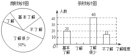 (1)接受问卷调査的学生共有 人,扇形统计图中“基本了解”部分所对应扇形的圆心角为 °;
