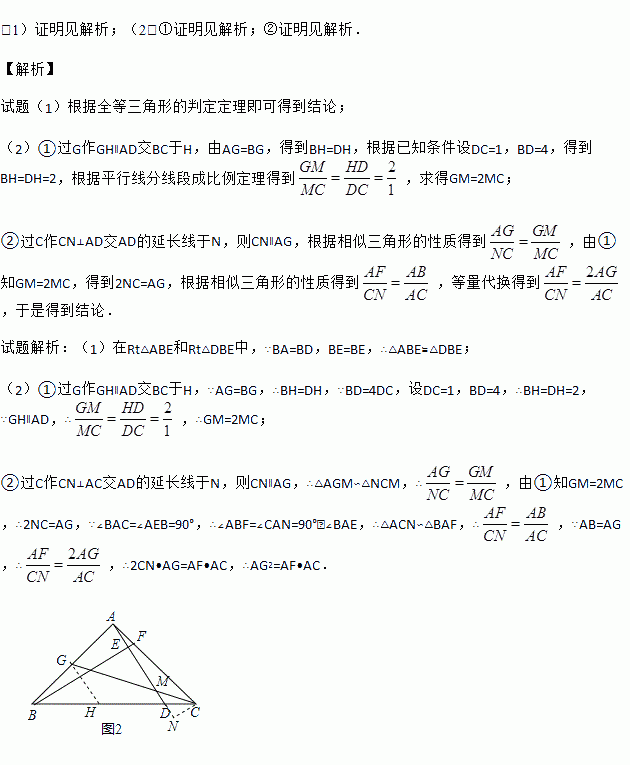 (2)如图2,若BD=4DC,取AB的中点G,连接CG交AD于M,求证:①GM=2MC;②AG2=AF•AC.