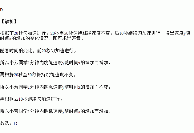 小芳在本学期的体育测试中,1分钟跳绳获得了满分,她的“满分秘籍”如下:前20秒由于体力好,小芳速度均匀增加,20秒至50秒保持跳绳速度不变,后10秒进行冲刺,速度再次均匀增加,最终获得满分,反映小芳1分钟内跳绳速度y(个/秒)与时间t(秒)关系的函数图象大致为( )