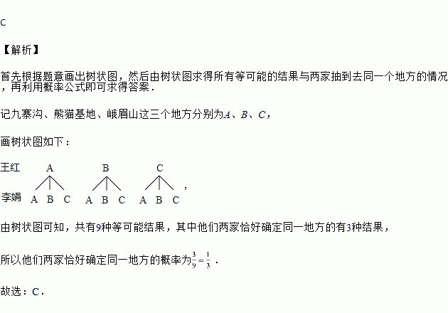 王红与李娟两家人计划在国庆期间从九寨沟、熊猫基地、峨眉山这三个地方,任选一个地方自驾游,他们两家各确定一个地方,则他们两家恰好确定同一地方的概率是