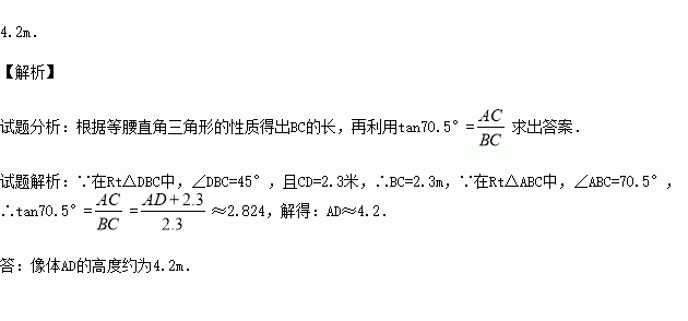 位于张家界核心景区的贺龙铜像,是我国近百年来最大的铜像.铜像由像体AD和底座CD两部分组成.如图,在Rt△ABC中,∠ABC=70.5°,在Rt△DBC中,∠DBC=45°,且CD=2.3米,求像体AD的高度(最后结果精确到0.1米,参考数据:sin70.5°≈0.943,cos70.5°≈0.334,tan70.5°≈2.824)