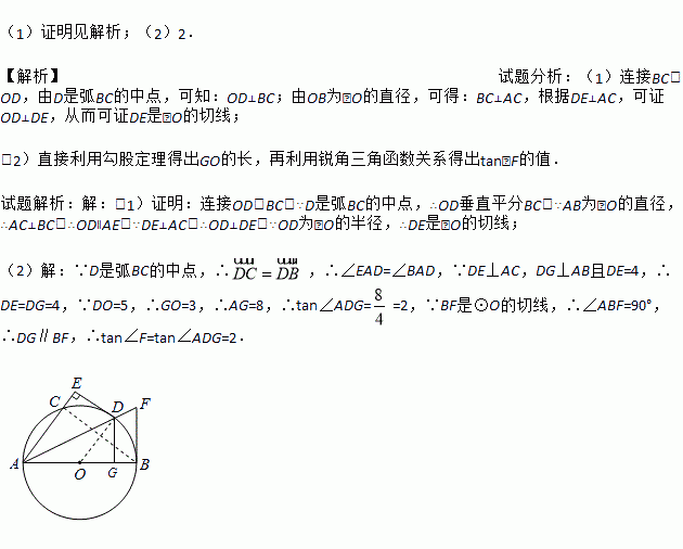 (2)已知DG⊥AB且DE=4,⊙O的半径为5,求tan∠F的值.