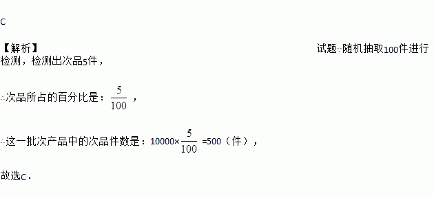 质检部门为了检测某品牌电器的质量,从同一批次共10000件产品中随机抽取100件进行检测,检测出次品5件,由此估计这一批次产品中的次品件数是( )