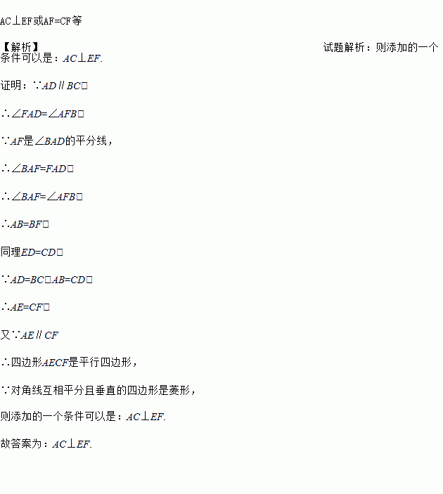 如图,平行四边形ABCD中,AF、CE分别是∠BAD和∠BCD的角平分线,根据现有的图形,请添加一个条件,使四边形AECF为菱形,则添加的一个条件可以是__________.(只需写出一个即可,图中不能再添加别的“点”和“线”)