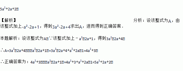 5a2+2a+2. 【解析】分析:设该整式为A,由该整式加上-a²-2a+1,得到3a²-2a+4求出A,进而得到正确答案. 本题解析:设该整式为A,∵该整式加上﹣a2﹣2a+1,得到3a2﹣2a+4, ∴A=3a2﹣2a+4﹣(﹣a2﹣2a+1)=3a2﹣2a+4+a2+2a﹣1=4a2+3, ∴正确答案为:4a2+3﹣(﹣a2﹣2a+1)=4a2+3+a2+2a﹣1=5...