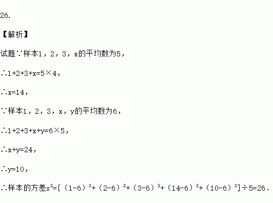 若样本1,2,3,x的平均数为5,又知样本1,2,3,x,y的平均数为6,那么样本1,2,3,x,y的方差是 .