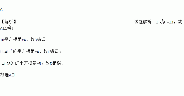 A. ±=±3 B. 16平方根是4 C. (﹣4)2 的平方根是4 D. ﹣(﹣25)的平方根是﹣5