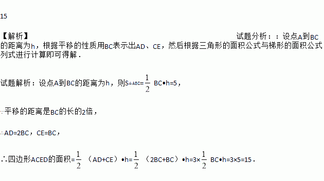如图,如果将面积为5的△ABC沿BC方向平移至△DEF的位置,平移的距离是边BC长的两倍,那么图中四边形ACED的面积为_____.