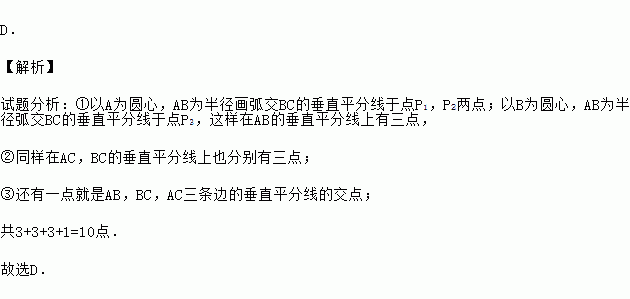 D. 【解析】 试题分析:①以A为圆心,AB为半径画弧交BC的垂直平分线于点P1,P2两点;以B为圆心,AB为半径弧交BC的垂直平分线于点P3,这样在AB的垂直平分线上有三点, ②同样在AC,BC的垂直平分线上也分别有三点; ③还有一点就是AB,BC,AC三条边的垂直平分线的交点; 共3+3+3+1=10点. 故选D.
