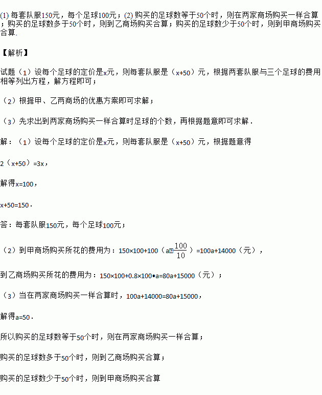 为发展校园足球运动,某县城区四校决定联合购买一批足球运动装备,市场调查发现,甲、乙两商场以同样的价格出售同种品牌的足球队服和足球,已知每套队服比每个足球多50元,两套队服与三个足球的费用相等,经洽谈,甲商场优惠方案是:每购买十套队服,送一个足球,乙商场优惠方案是:若购买队服超过80套,则购买足球打八折.