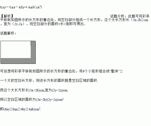 如图,要设计一幅长为3xcm、宽为2ycm的长方形图案,其中有两横两竖的彩条,横彩条的宽度为acm,竖彩条的宽度为bcm,问空白区域的面积是多少?