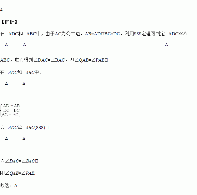 如图,小敏做了一个角平分仪ABCD,其中AB=AD,BC=DC,将仪器上的点A与∠PRQ的顶点R重合,调整AB和AD,使它们分别落在角的两边上,过 点A,C 画一条射线AE,AE就是∠PRQ的平分线。此角平分仪的画图原理是:根据仪器结构,可得△ABC≌△ADC,这样就有∠QAE=∠PAE。则说明这两个三角形全等的依据是( )