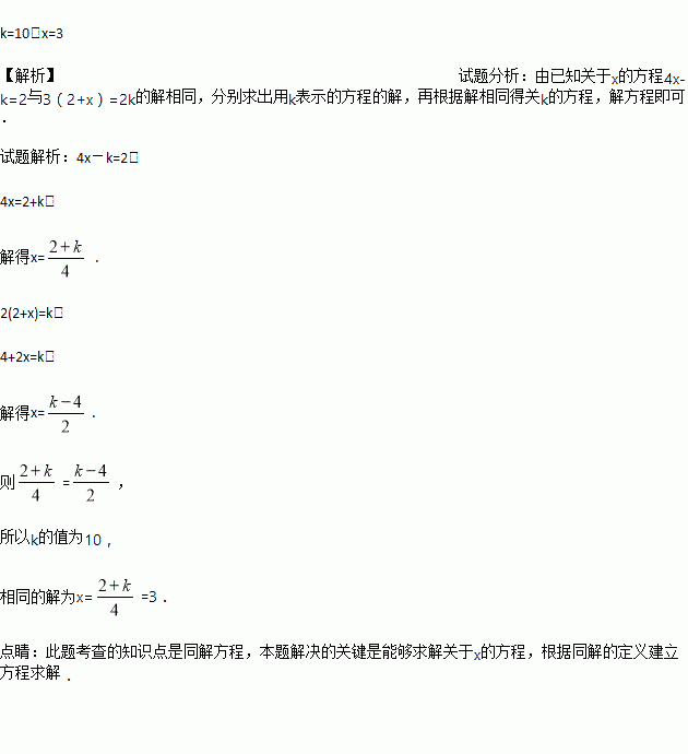 已知:关于x的方程4x-k=2与2(2+x)=k的解相同,求k的值及相同的解.