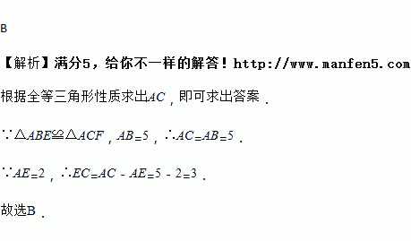 如图,若△ABE ≌ △ACF,且AB = 5,AE = 2,则EC的长为 ( ).