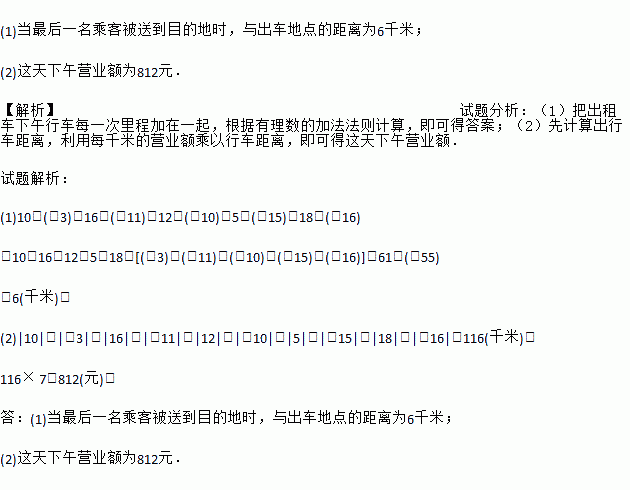 (1)当最后一名乘客被送到目的地时,与出车地点的距离为6千米; (2)这天下午营业额为812元. 【解析】试题分析:(1)把出租车下午行车每一次里程加在一起,根据有理数的加法法则计算,即可得答案;(2)先计算出行车距离,利用每千米的营业额乘以行车距离,即可得这天下午营业额. 试题解析: (1)10+(-3)+16+(-11)+12+(-10)+5+(-15)+18+(-16...