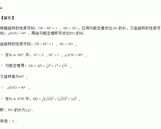 如图,在△ABC中,∠ACB=90°,将△ABC 绕点A顺时针旋转90°,得到△ADE,连接BD,若AC=3,DE=1,则线段BD的长为